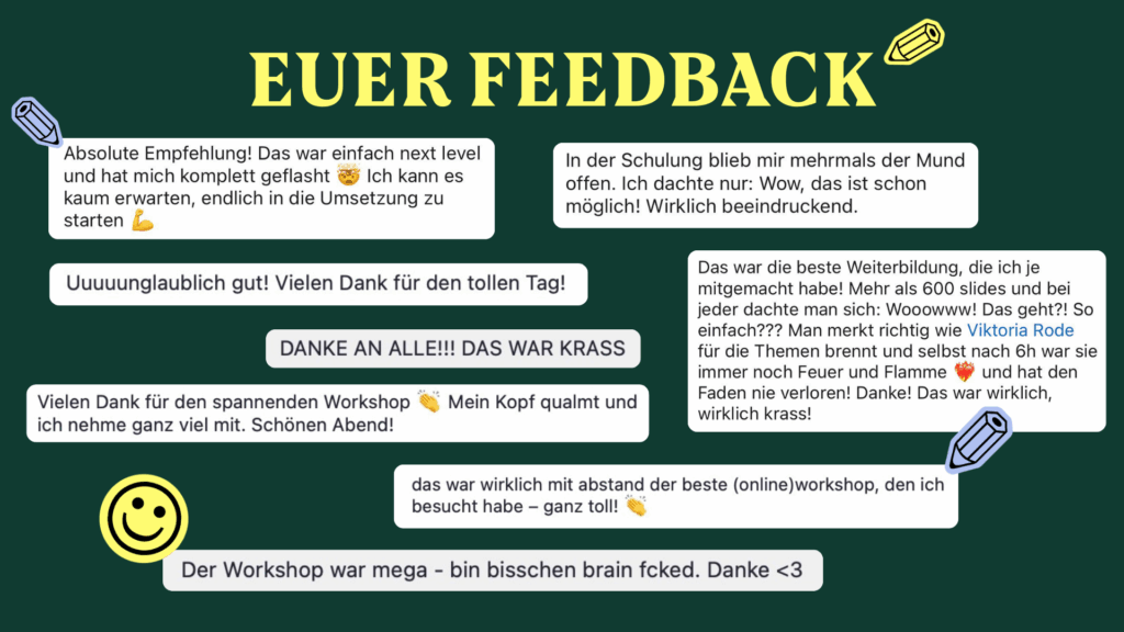 Der Tag wird in fünf intensive Sessions mit KI-Expertin Viktoria Rode geteilt, in denen du die wichtigsten Tools für Text, Bild, Video, Voice und Effizienz kennenlernst – ohne Überforderung, aber mit echtem Praxisbezug an einem Tag. Du erhältst kurz vor Start deinen persönlichen Zugangslink zu unserem Meeting. Pausen gibt’s natürlich auch 😉